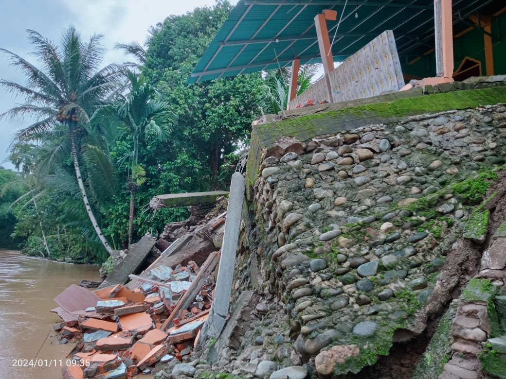 “Dam penahan tebing Desa Sosokan ambruk lantaran tak kuasa menahan derasnya arus sungai. MCK masjid hanyut, Pamsimas Desa Sosokan terputus,” ujarnya.